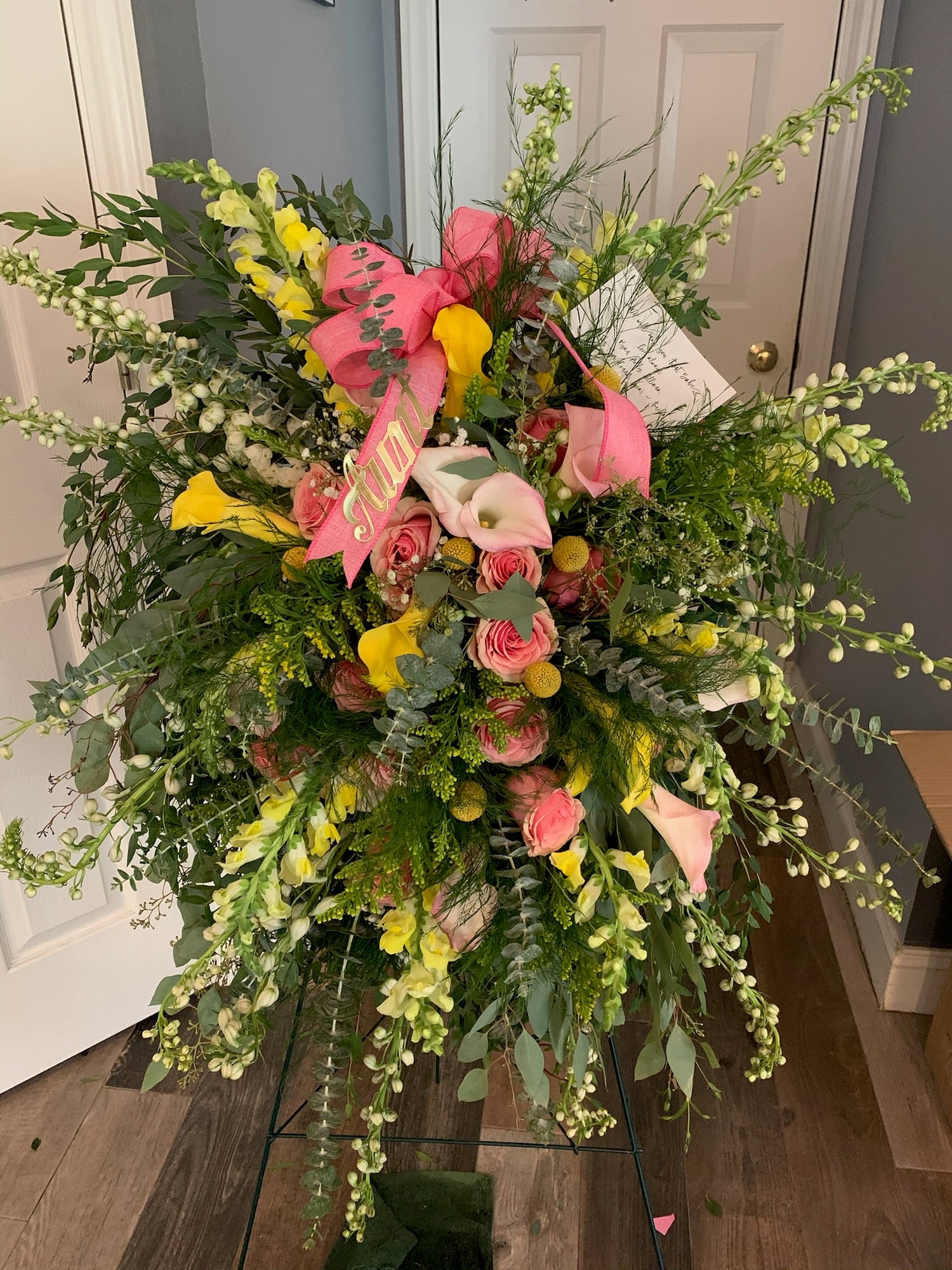 Pay tribute with a beautiful Standing Spray, a heartfelt floral arrangement displayed on an easel to honor your loved one. Crafted with fresh, seasonal blooms, each spray is designed to express love, respect, and remembrance during this difficult time.